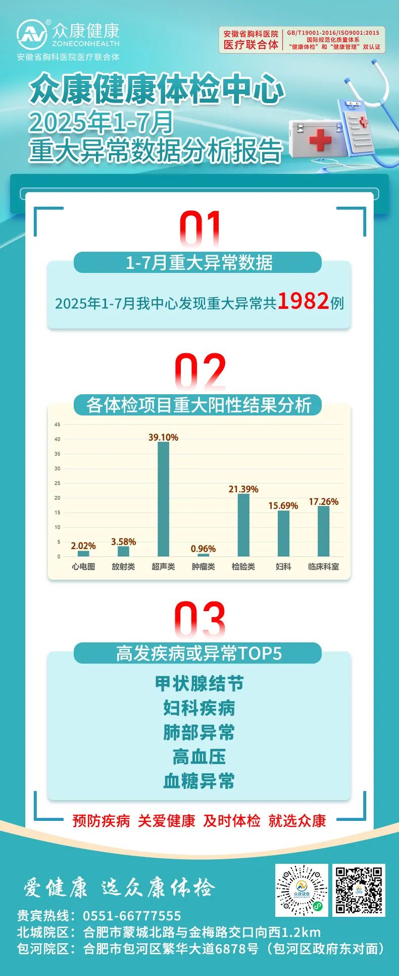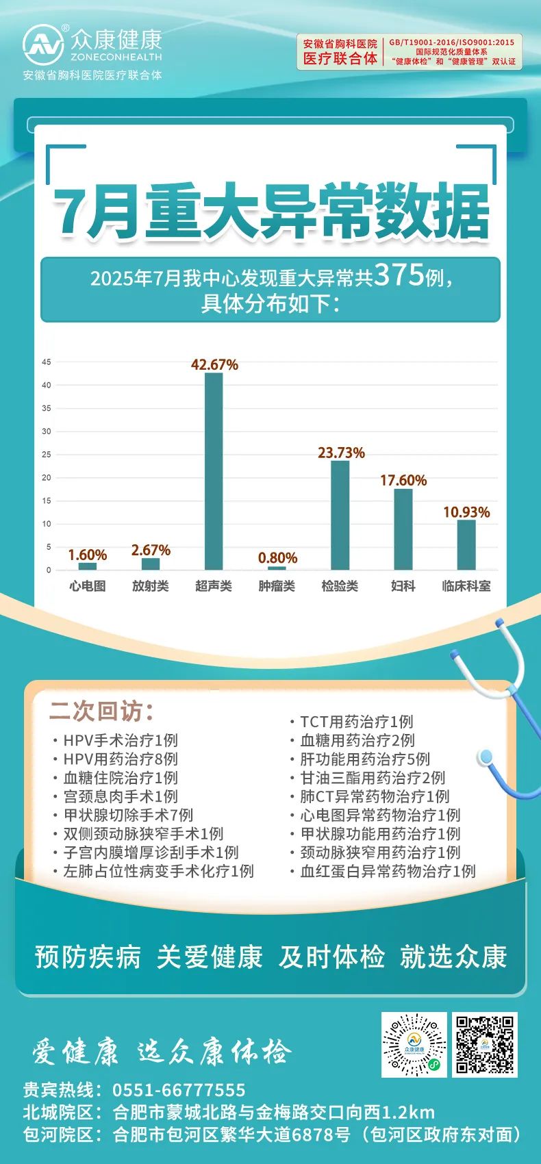 2025年7月,众康健康体检中心两院区共发现重大异常375例!