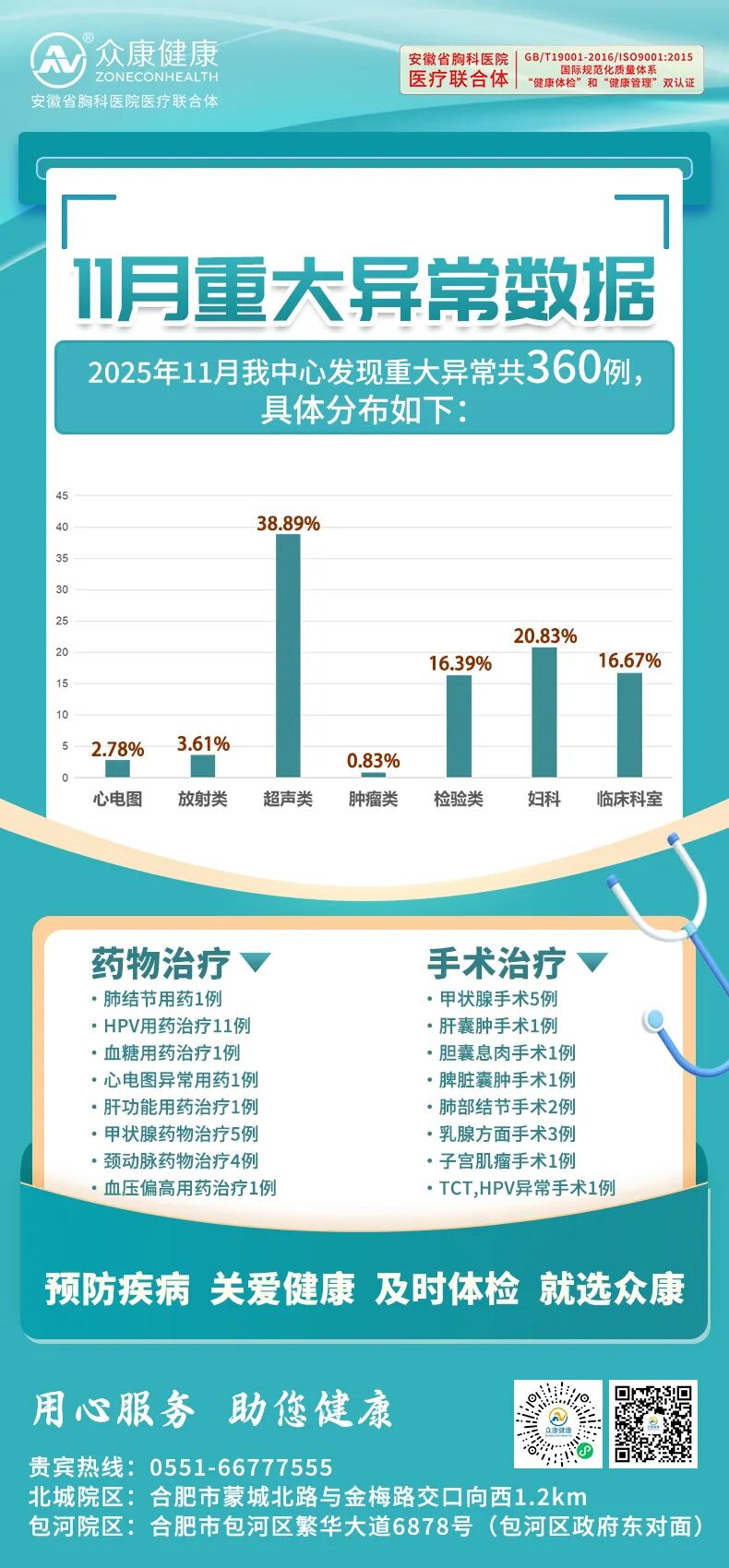 2025年11月,众康健康体检中心两院区共发现重大异常360例!